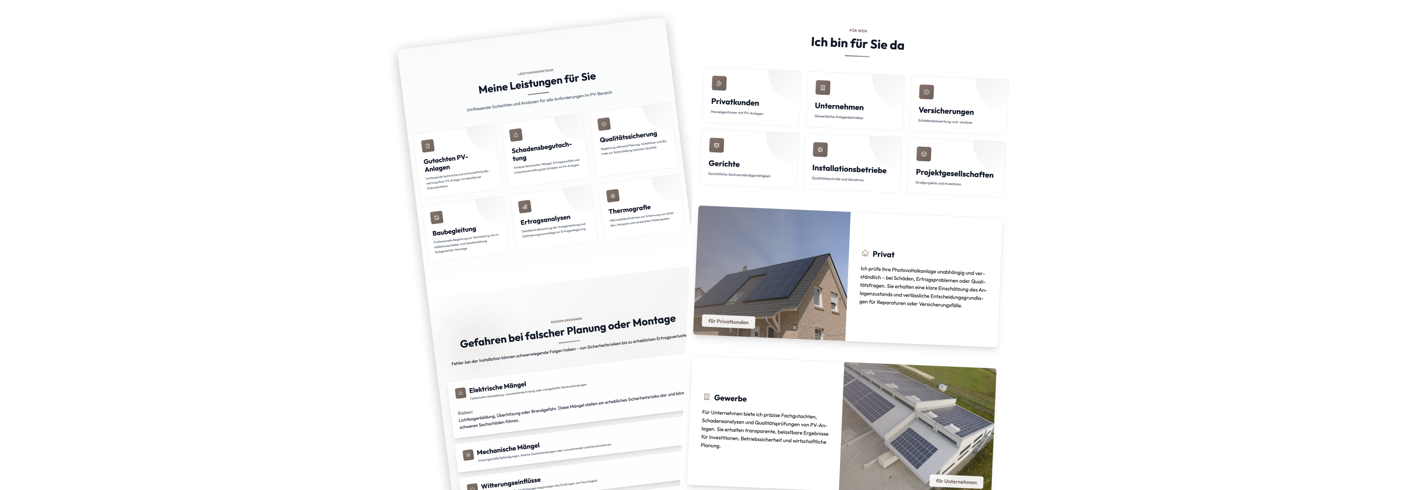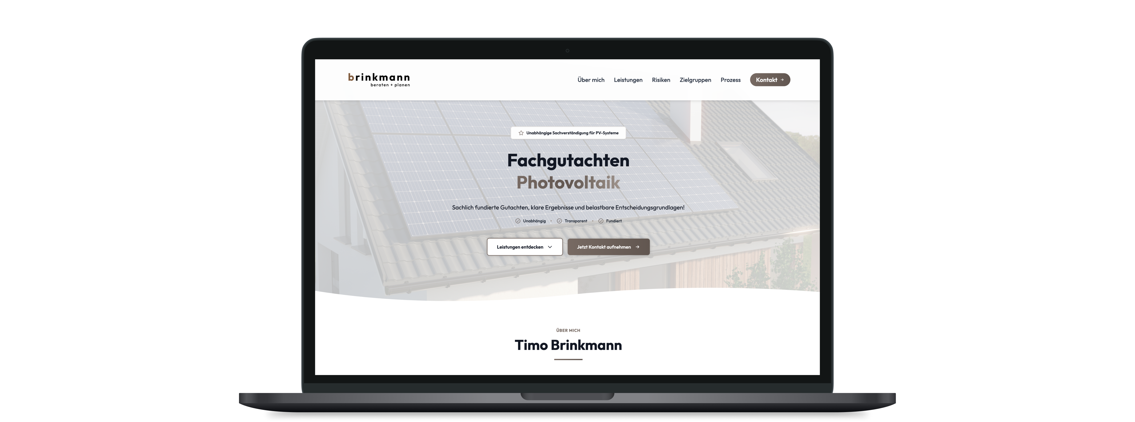 Photovoltaik ist ein technisch anspruchsvolles Feld, in dem belastbare Entscheidungen auf klaren Bewertungen beruhen müssen. Mit PV-Faktencheck haben wir für den unabhängigen Sachverständigen Timo Brinkmann einen kompakten Onepager entwickelt, der genau diese Haltung digital abbildet. Ziel war es, fachliche Tiefe sichtbar zu machen, ohne sie auszubreiten, und Inhalte so zu strukturieren, dass sie schnell erfassbar und nachvollziehbar bleiben.